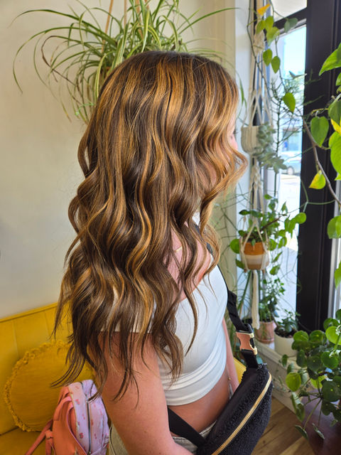 Includes a custom gloss, root smudge or base break, blow dry, & heat styling